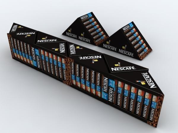 Nescafé雀巢三合一棒包裝設計,設計為擺放50件雀巢三合一棒的一個新包裝,它能放置在商店柜臺旁,家里的廚房,會議期間的桌面上等等。如果你把箱沿其對角線,你就會得到兩個三角部分。每一個部分可以擺放25支。三合一棒在框中,可以穩定地保持亦可容易取出。框的設計可以折疊,沒有任何膠結。