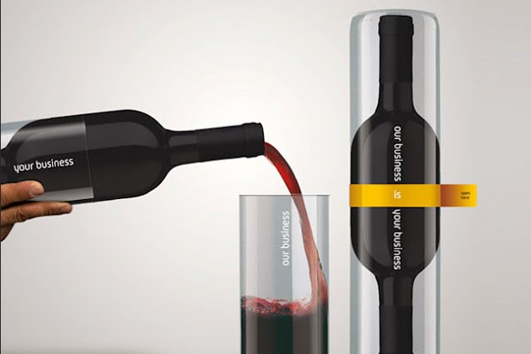 仔細賞析一下這組案例,第一幅作品是將酒瓶設計成棒槌形狀,并且在外面設計了一個外玻璃罩,透明、磨砂材質讓消費者一眼就能看出酒的內在品質。