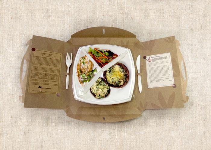 這是一款產品整體包裝設計項目,該公司為顧客提供自然健康的食品送貨服務,這個獨特的折疊盒子構成了一個獨特優化的產品運輸安全保障結構,減少了工人整理搬運的時間成本,方便顧客個人攜帶以及使用,放平的保障設計也可以成為食用食品時的餐墊。該產品的包裝材料環保無污染,可以進行自然降解。更為巧妙的是,該食品包裝袋子里面已經設置了各種飯食隔離的區域,不至于讓口味混淆。