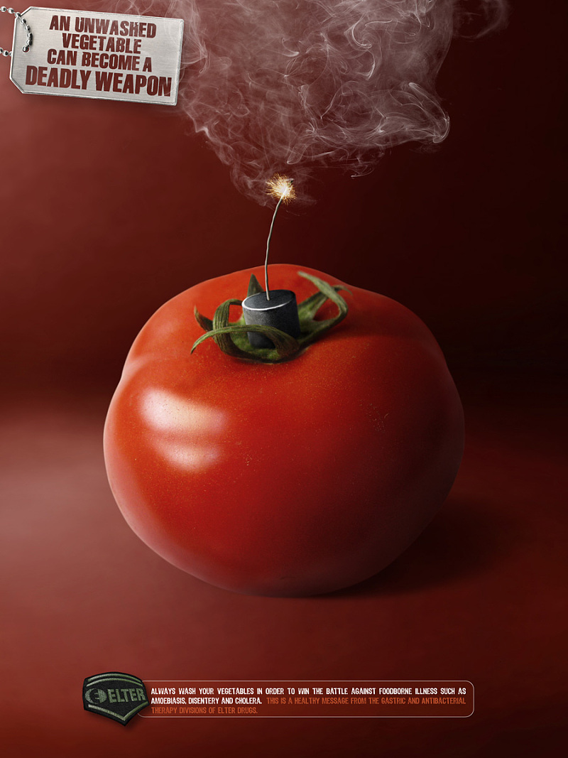這個廣告通過把一個未洗的洋薊比喻成炸彈來警告公眾食源性疾病的危害。 通過創建一個視覺比喻,Elter藥業公司能夠傳達有關食品安全和Elter藥物自己的抗菌治療部門的強烈信息,而不顯示任何敏感的圖像。