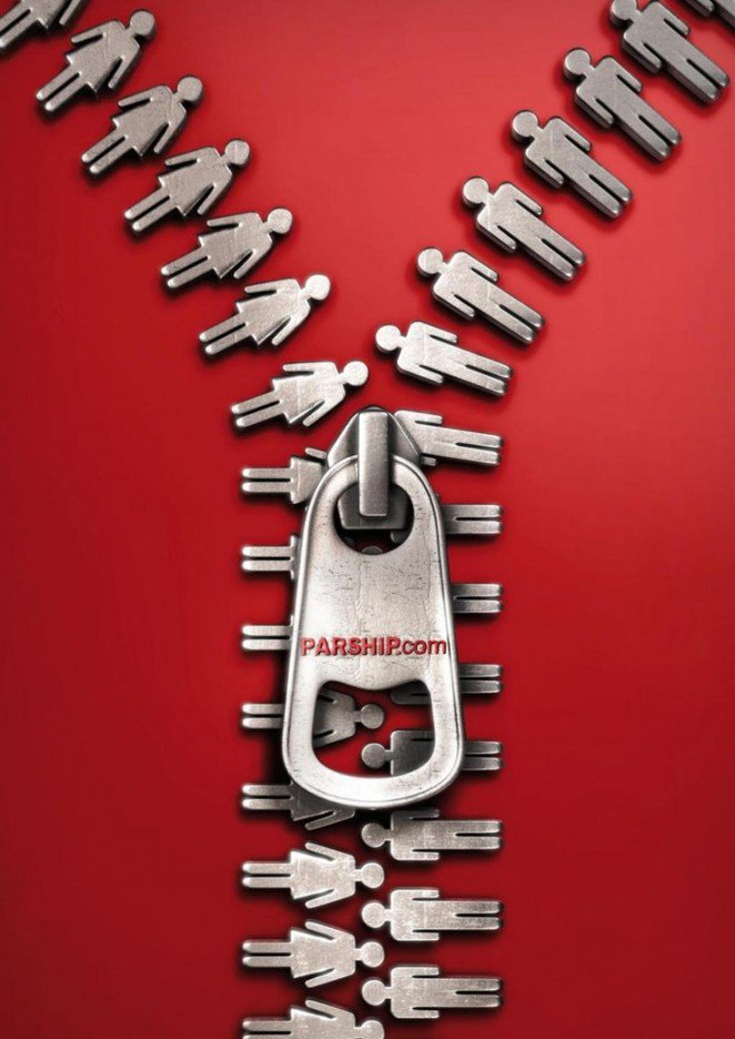 這個廣告是針對在線相親服務網站——Parship.com設計的一個廣告,它描繪了男人和女人被拉鏈拉在一起的符號。 在創作這個廣告的過程中,設計師們會頭腦風暴那些能夠代表男性和女性(通衛生間符號)的符號和視覺,包括如何把兩個符號拉在一起的想法(拉鏈)。
