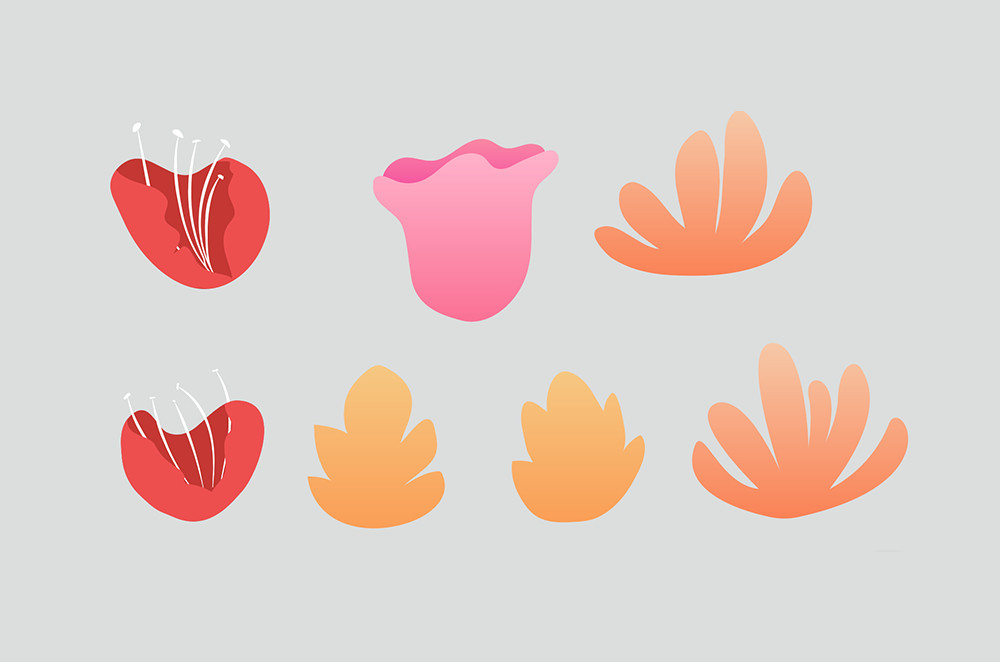 再來增加不同的花朵造型,上兩步是花朵的正面,現(xiàn)在來繪制花朵的側(cè)面造型。側(cè)面造型的填色為橙紅色與黃色。在屬于花朵“背面”的部分填色要深一些。這樣就能帶出一定的空間感。填色時注意色彩上的微妙的漸變。