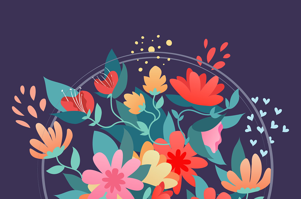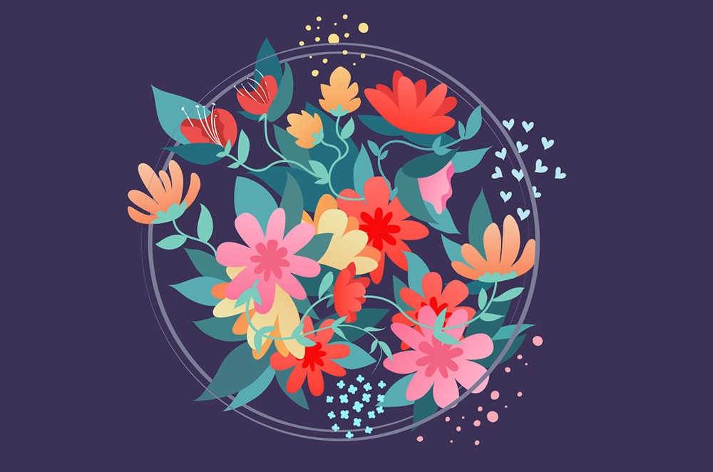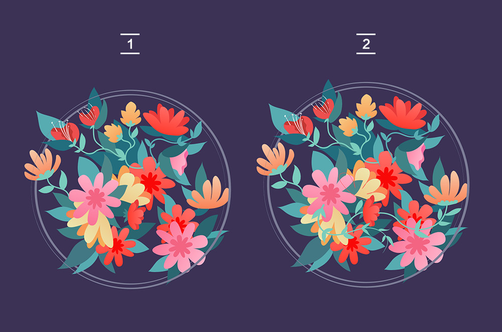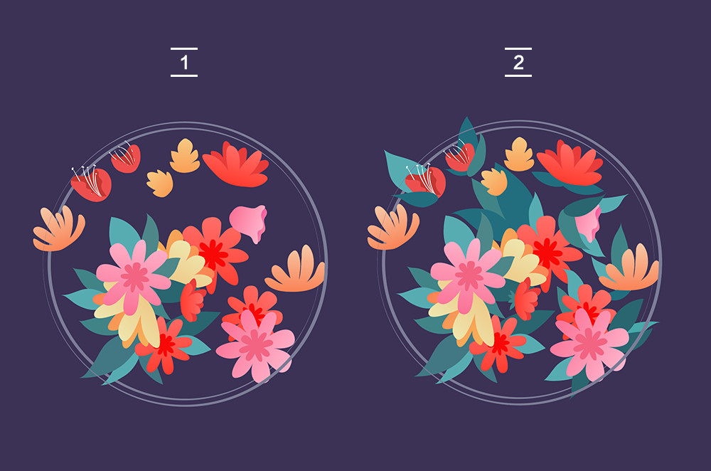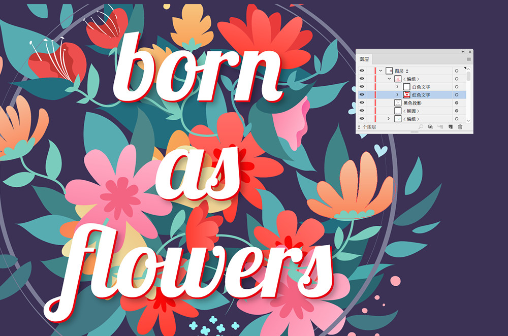 嵌入文字可以說也是一項(xiàng)很繁瑣的工序,你需要把文字對象不斷來回拆分重組,利用層次關(guān)系甚至是形狀生成工具進(jìn)行細(xì)微的調(diào)整。總的來說,你要讓整個畫面看上去“合理”。文字遮擋的部分隱沒于花束中,空間上的層次要分明。