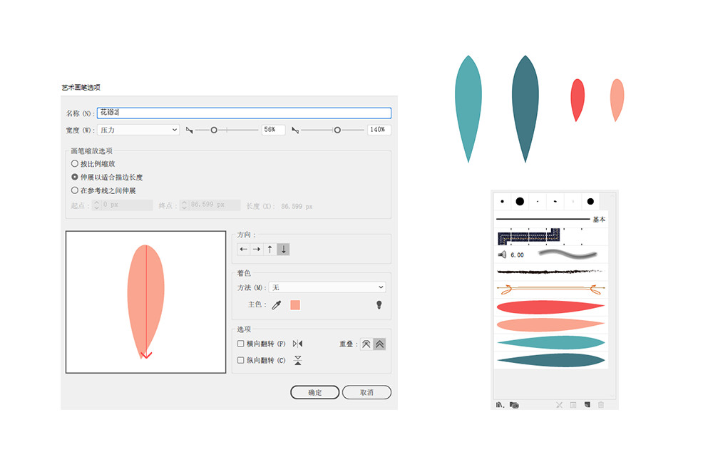 最開始就像準(zhǔn)備符號一樣,讓我們用鉛筆工具畫出葉片和花瓣。然后將其分別拖入到畫筆面板中,彈出創(chuàng)建畫筆類型選擇為“藝術(shù)畫筆”,對藝術(shù)畫筆的選項(xiàng)參數(shù)進(jìn)行設(shè)置,需要注意的是寬度可以選擇“壓力”,最小值和最大值都進(jìn)行調(diào)整,并點(diǎn)擊確定。