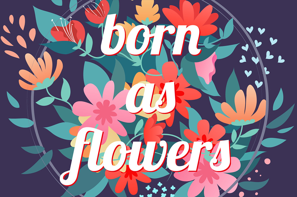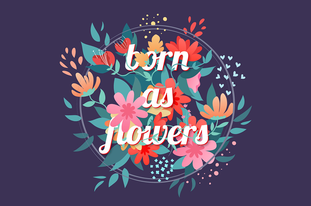 先用文字工具寫出“born as flowers”的文字,排列成為三行,并居中顯示。字體我運(yùn)用的Lobster,連體字形更能很好的和藤蔓的外形關(guān)系結(jié)合起來。