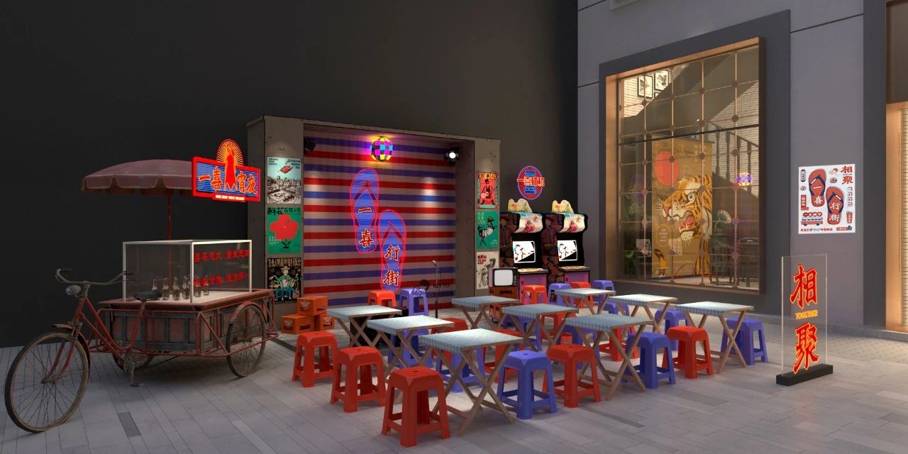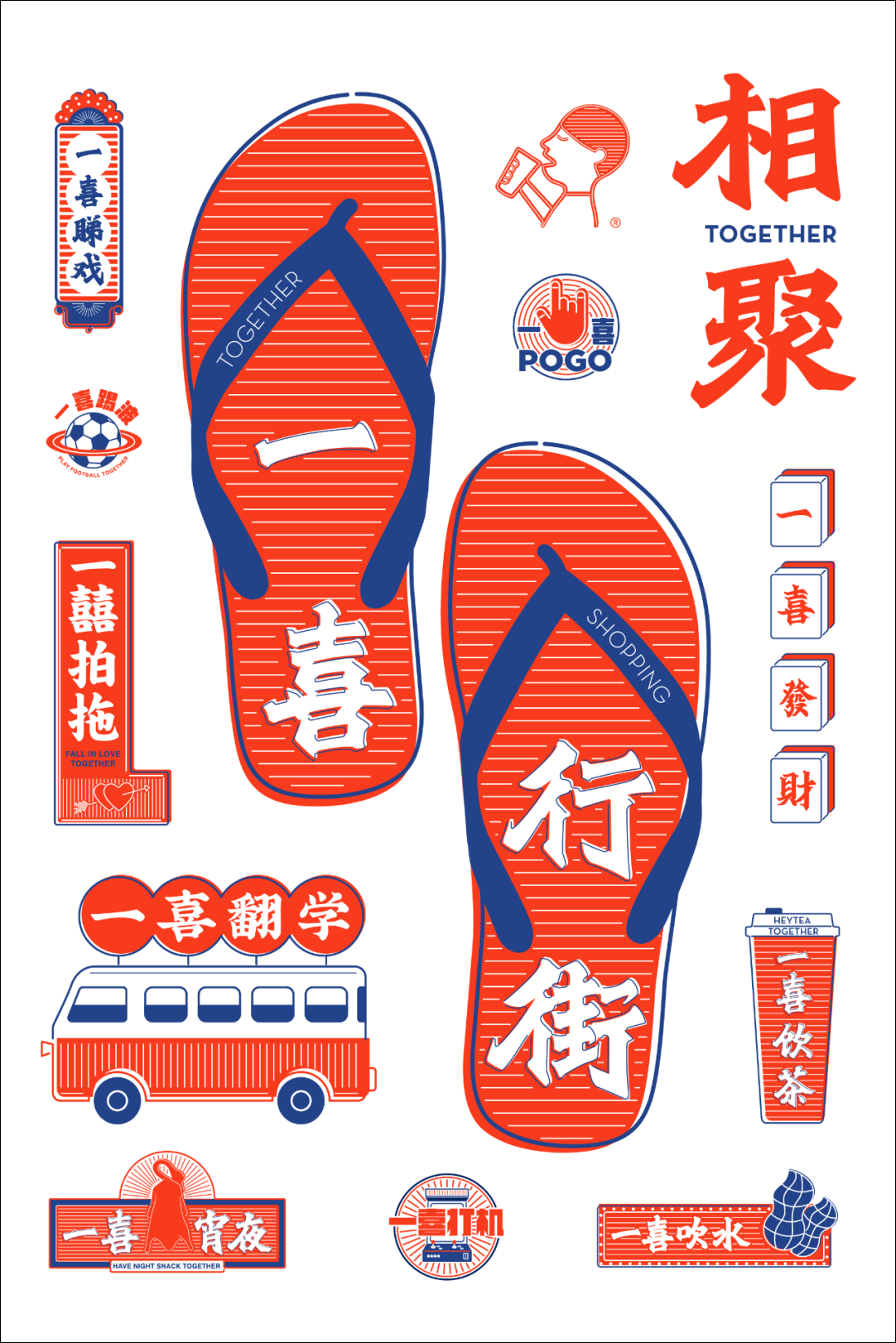 喜茶,一個被奶茶事業(yè)耽誤的設(shè)計公司,胡子,一個為五條人打造靈魂海報的設(shè)計師,同樣是誕生于廣東獨有的文化之下,這兩者相遇,會迸發(fā)出怎樣的火花呢?一喜行街主題海報:海報延續(xù)了喜茶一貫的風(fēng)格,紅與藍的配色打造復(fù)古、簡約的意象,而“人字拖”、“牌匾”等元素,是五條人海報最常用到的東西,海報排版也似五條人海報一樣隨性。海報文案的粵語諧音也非常有趣:一喜睇(dì)戲、、一喜唱K、一喜發(fā)財、一喜飲茶、一喜宵夜、一喜旅行,體現(xiàn)了年輕人自由灑脫的生活態(tài)度。如果說上面兩幅海報代表 “白天”,那么下面這兩幅 “霓虹” 版的海報就帶我們開啟了 “夜晚” 模式。同樣的設(shè)計,因為顏色的不同,給觀眾的感覺也截然不同。喜茶的手提袋與奶茶杯一直都是他們的品牌亮點,將全新的設(shè)計融入包裝上面,再次展現(xiàn)了喜茶品牌設(shè)計的多元化。精致、小資的喜茶門店視覺,結(jié)合“紅白藍編織袋”背景墻,折疊桌、紅藍塑料凳等大排檔元素,這波反差,真是令人大開眼界這樣聲勢浩大的跨界。
