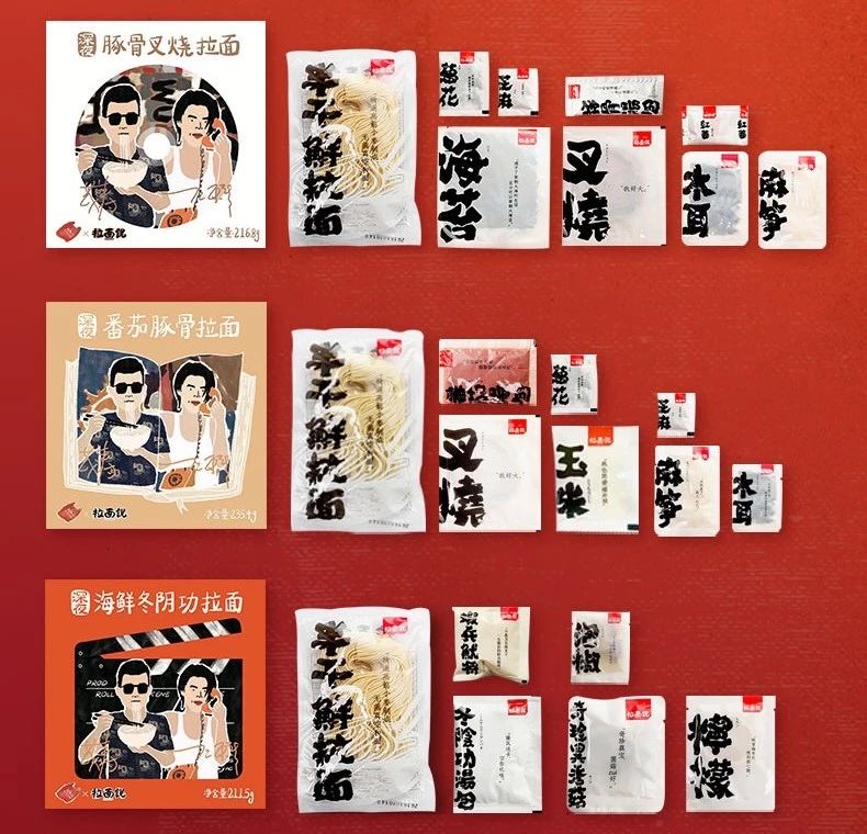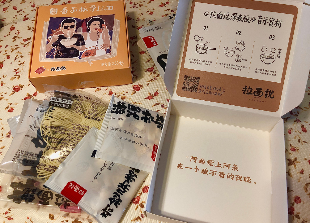 五條人和拉面說的聯(lián)名,設(shè)計依舊土潮土潮的。看這背景滿滿復(fù)古懷舊感的宣傳海報,一看就很“五條人”!包裝設(shè)計也是土潮土潮,包裝通過復(fù)古配色的漫畫形式呈現(xiàn)了樂隊成員茂濤在吃面和穿著白背心的仁科在打電話的場景,借用了五條人喜歡打電話的梗。而三款不同口味的包裝,用音、影、書的概念來設(shè)計。分別以“光盤”、“場記板”和“書”作為框架元素,增加了趣味。打開包裝,里面除了泡面教程以外還附上一句“土味情話”,比如以下這句:“阿面愛上阿條,在一個睡不著的夜晚。”有多少人看著文案不禁哼出來的。除此之外,宣傳海報的設(shè)計,也是非常地接地氣,海報整體采用了具懷舊感的色調(diào),主體為這次聯(lián)名款的新包裝和冒著熱氣的實物拉面為主,而背景則采用舊風(fēng)扇、舊電視機、收音機等具有年代感的物品渲染氣氛。可以說,當(dāng)接地氣的五條人和具煙火氣的拉面說結(jié)合,兩者的氣質(zhì)非常地融洽了。