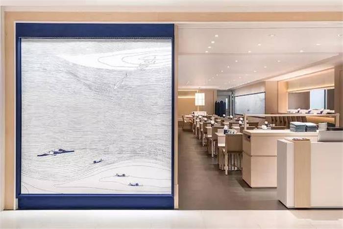 說起日式風,肯定少不了日料店。這家日料餐廳,以日本傳統花紋樣式青海波為品牌主要視覺元素,通過靛藍色和白色混搭的青海波圖案,呈現出自由開放的樣貌。簡約流動的線條,與插圖結合,頗有意趣。不僅將日本民間文藝元素進行圖形化展示,也是餐廳提供新鮮食材的一種比喻性表現。餐廳的LOGO以一個簡化的圓形米飯碗樣式進行呈現,圖形居中,文字進行環繞,簡約中又有立體突出的效果。