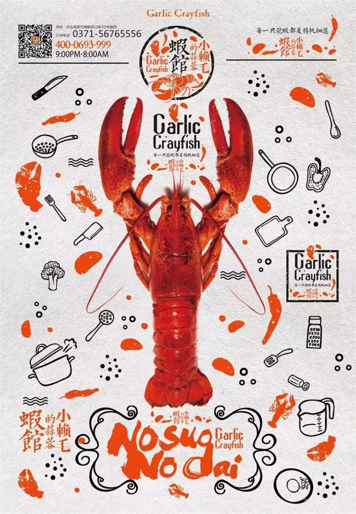 小賴毛的蒜蓉蝦館采用濃厚的色彩來,表現(xiàn)海鮮的鮮與兇猛,大膽的紅白黑撞色能從感官上刺激食欲,手繪圖案搭配兇猛小龍蝦,手繪風(fēng)與寫實(shí)風(fēng)的碰撞帶來強(qiáng)烈的視覺效果。以眾多細(xì)小的廚房用品為輔助圖形,細(xì)節(jié)感與層次感up up up,涂鴉風(fēng)格的應(yīng)用很年輕時尚。