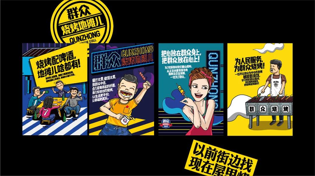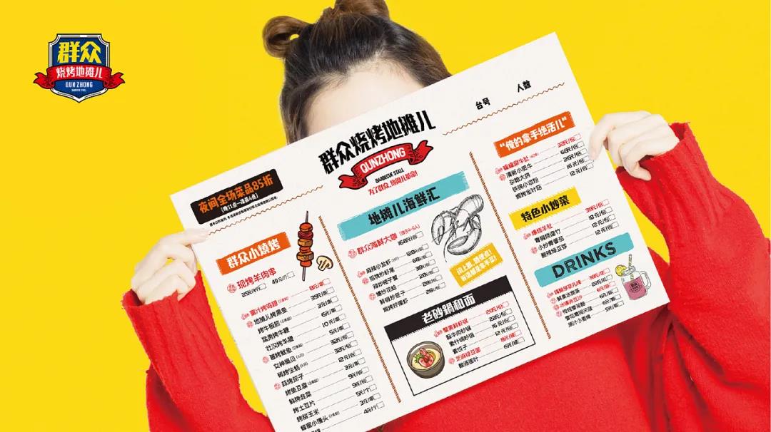 這個燒烤品牌是基于群眾的定位而進行命名的,群眾燒烤地攤兒,既表明品牌是面向大眾的、百姓的,在價格上也是親民的,同時又體現街頭市井文化,突出燒烤品類接地氣的品類屬性。品牌的LOGO標志采用了徽章式圖標,徽章與盾牌符號相結合,體現食品的安全性;紅旗飄帶體現革命屬性,也象征著只是一次燒烤改革;群眾二字格外顯眼,強調品牌的大眾親民,這些元素重新組合,構成超級圖標。