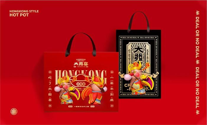 這是一個(gè)以“發(fā)”為主視覺設(shè)計(jì)的重慶牛油火鍋品牌,結(jié)合了財(cái)神、牛年等具有喜慶氣氛的元素,整個(gè)品牌設(shè)計(jì)十分喜氣。品牌的LOGO設(shè)計(jì)里也將財(cái)氣蘊(yùn)含其中,光從品牌的名稱大發(fā)喜來(lái)看,就足以明了品牌的基調(diào),采用繁體字的發(fā)字容易使人聯(lián)想到麻將的發(fā)財(cái)牌,將發(fā)財(cái)?shù)脑妇靶蜗蠡沧值慕鹪獙氃煨秃茳c(diǎn)題,加上標(biāo)志下方的銅錢,無(wú)時(shí)無(wú)刻不在強(qiáng)調(diào)“發(fā)”的核心主題。“一家有想法的火鍋”的廣告語(yǔ)充滿想象,會(huì)讓人忍不住想要探究這到底是一家怎么樣有想法的火鍋店。紅色大肆渲染了喜慶的氣氛,綠色、黑白、棕杏等輔助色的應(yīng)用,讓品牌更具層次感。思源黑體厚重且有力量,唐風(fēng)隸書體更有古韻,能很好的展現(xiàn)品牌的總體氣質(zhì)。品牌的輔助圖形借助了各種與財(cái)相關(guān)的元素和文字表示,結(jié)合牛年,將財(cái)、喜都放大,傳遞富裕、富足的美好愿景。發(fā)財(cái)和牛氣是大發(fā)喜的核心,加上大發(fā)喜的主打品類是牛油火鍋,以及今年的牛年年份,所以選用牛財(cái)神作為品牌的IP形象。這個(gè)牛財(cái)神有著富態(tài)的身軀,喜感和藹的面容,不是拿著金算盤就是拿著金元寶,實(shí)在趣味!IP也間接體現(xiàn)了品牌的名稱,整個(gè)牛身軀對(duì)應(yīng)大字,牛財(cái)神帽子上的發(fā)和腰帶上的喜,與品牌名稱大發(fā)喜照應(yīng)。牛財(cái)神降臨,打造了多款牛的造型,牛財(cái)神或像打了雞血一樣,或眼冒金星、愛心,或是像個(gè)老頑童一樣騎著木馬到處跑,這些牛形象看起來(lái)都十分喜感趣味,實(shí)力演繹“吃了大法喜,一年牛到底”。