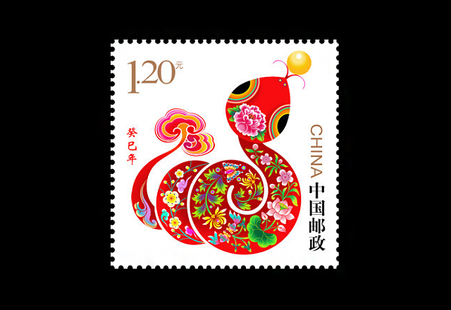 據(jù)介紹,《癸巳年》蛇年生肖郵票設(shè)計(jì)者為清華大學(xué)美術(shù)學(xué)院教授、博士生導(dǎo)師、2011年兔年生肖郵票設(shè)計(jì)者吳冠英。他表示,生肖郵票作為一種大眾的藝術(shù),需要被人普遍接受,所以在設(shè)計(jì)中加入了很多民間傳說等中國傳統(tǒng)語言。“蛇身用的是紅色,因?yàn)楣糯v赤蛇是大吉的意思,牡丹頭飾表示富貴,蛇身上代表四季的桃花、荷花、菊花、梅花,表達(dá)反復(fù)、長久的意思。”對(duì)于蛇票上最為與眾不同的珠子,吳冠英解釋說,這顆珠子源于晉代小說《搜神記》里蛇銜明珠以報(bào)恩的故事。