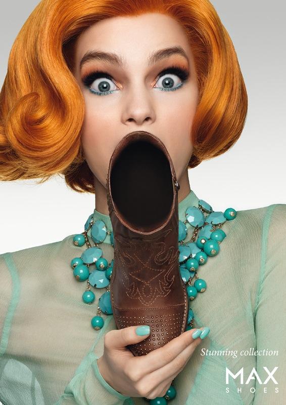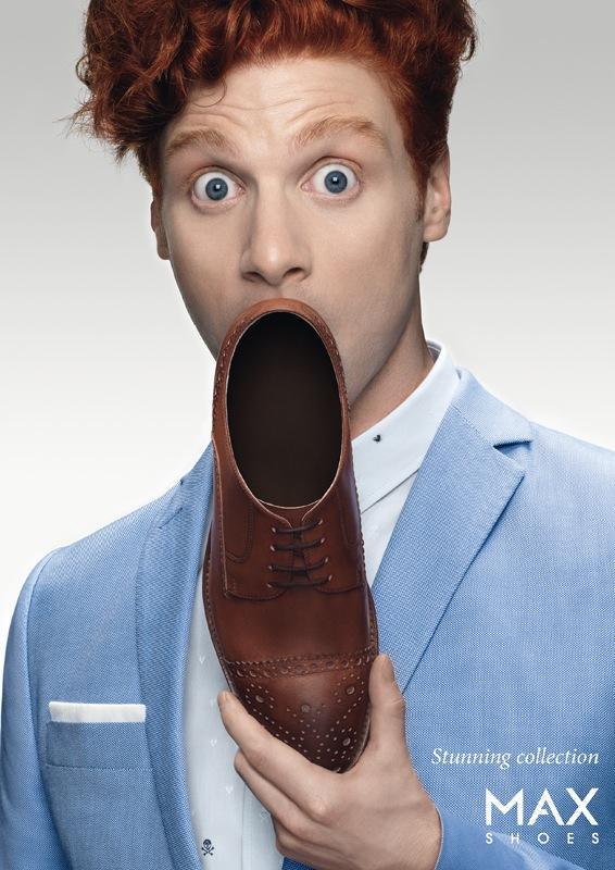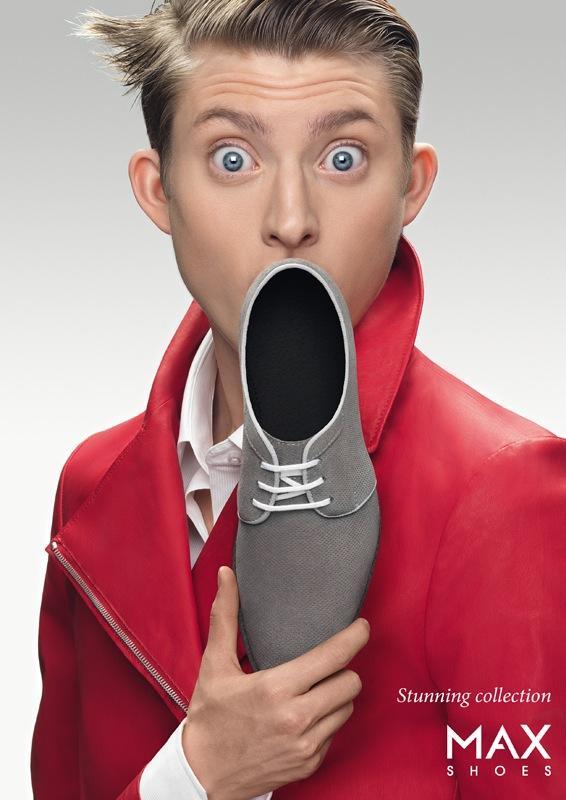 巧妙利用鞋的空洞充當(dāng)人驚訝時(shí)張大的“嘴巴”,可見(jiàn)去MAX買(mǎi)鞋實(shí)在讓人驚喜連連。就平面表現(xiàn)來(lái)說(shuō),女人那一張比男人的兩張更顯張力。