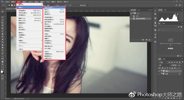 如圖,我們在進行圖層調色等操作的時候,經常會用到圖像-調整里的功能。在這個地方調整圖層和剛才的刪除一樣,也是在原圖上進行修改,屬于破壞性的編輯,后面要再進行細節調整就很難辦了: