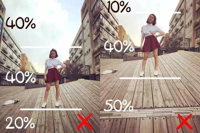 腳部貼近照片底部,頭部留空40%,才是站著顯腿長的正確構(gòu)圖姿勢,如下圖