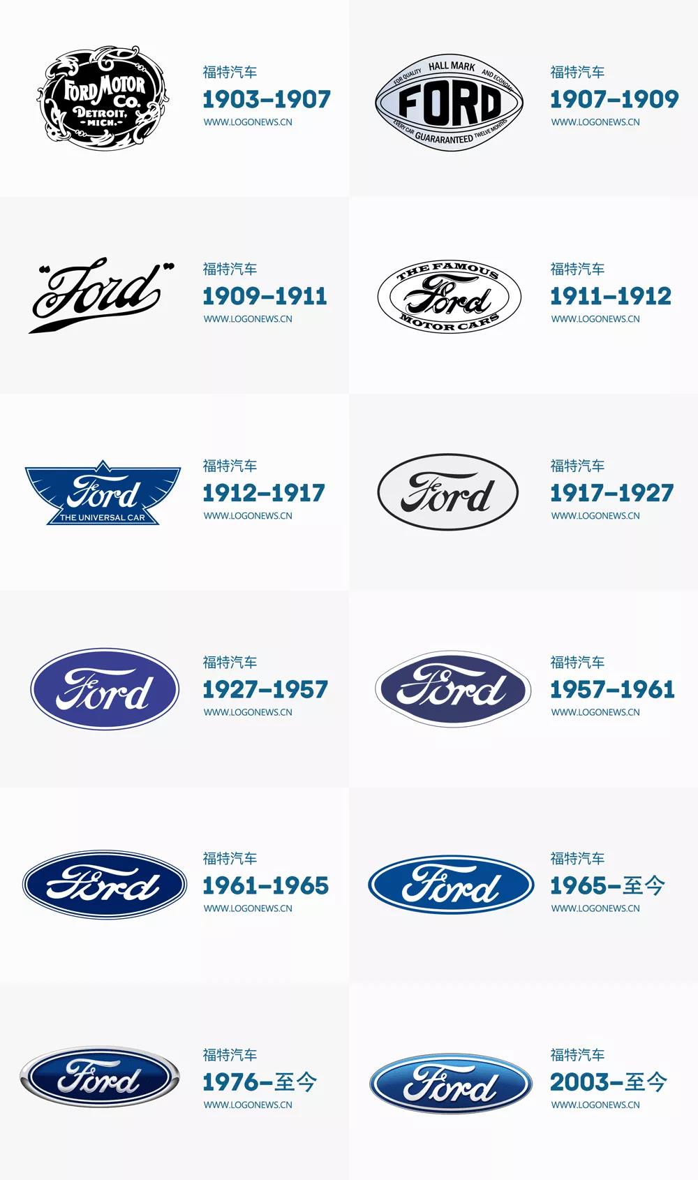 福特汽車公司(Ford)由美國汽車工程師與企業家亨利·福特(Henry Ford)于1903年創立,現為一家跨國的企業生產商。在福特117年的發展歷史上,其品牌LOGO也有多個版本的更迭。而我們今天看到的以「Ford」和藍色橢圓底色的LOGO在1927年就已經出現,但「Ford」字體設計早在1909年就有了。通過相關的資料查詢,我們找到了福特從1903年至今的LOGO演變,在多達12次的更新變化中,1909年設計的字體最終被延續保留了下來。
