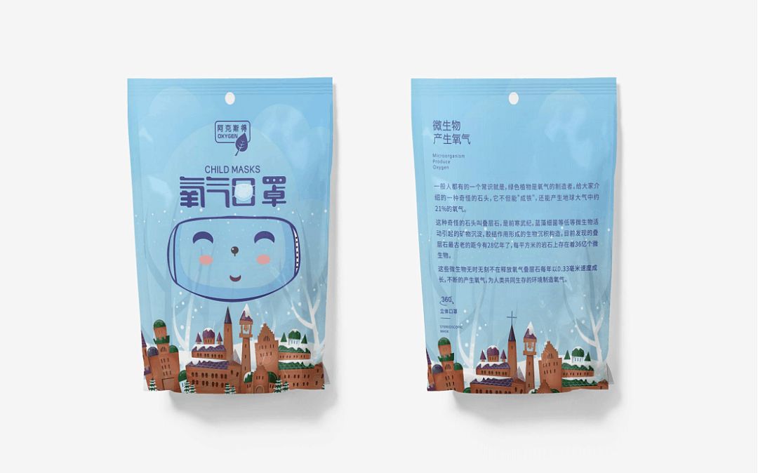 冬季飄雪的故事性場景插畫設計,配以歐洲風情的城堡元素,口罩包裝也更加唯美動人,包裝中央的笑臉設計,仔細一看其實是口罩的輪廓形象,暗藏玄機的IP描繪卻也親和感十足。