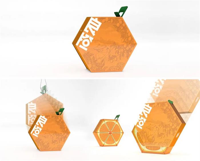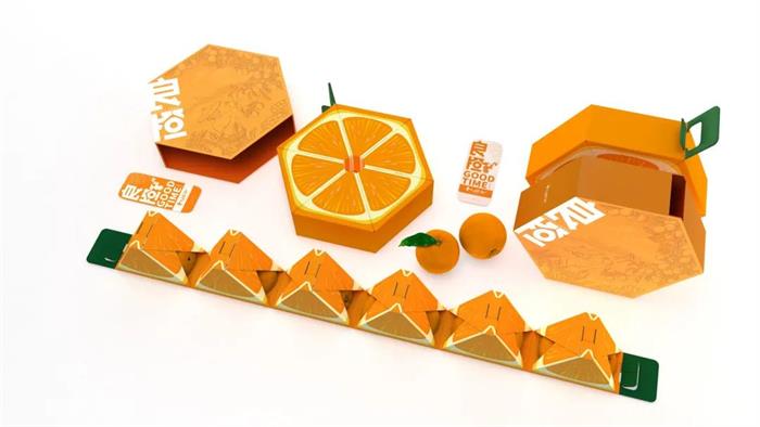 良橙同音良辰,意寓美好的日子,美好的時光,美好的橙子。此款仿橙子的折紙盒包裝設(shè)計幫助品牌定位市場,并且給消費者們留下了深刻的印象。外殼的包裝上展示著橙園自然勞作的景象,脫去外殼的包裝,里面竟然也是一牙一牙地一個被切開的橙子。巧妙地運用仿生手法,使得包裝具有具有極高的辨識度,包裝與產(chǎn)品之間緊密聯(lián)系。