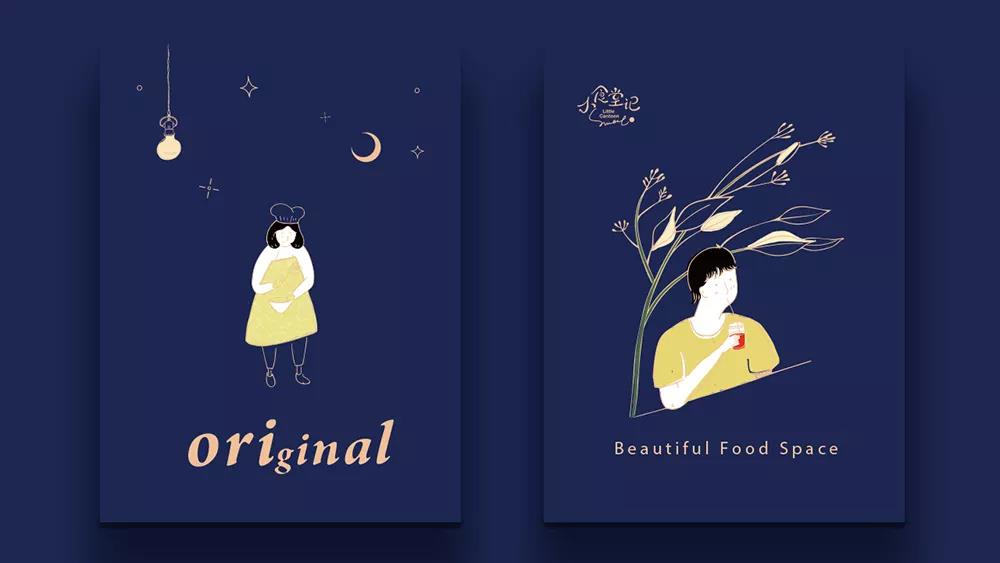 品牌VI以手繪風(fēng)格的插畫為主,構(gòu)建出烹飪和用餐的場(chǎng)景,再使用線稿和色塊的融合,清新又簡(jiǎn)約,形成獨(dú)特的、趣味感十足的品牌個(gè)性,讓人印象深刻、過(guò)目不忘。海報(bào)的設(shè)計(jì)用了品牌主色調(diào)深藍(lán)色作為背景,搭配鮮艷明亮的色塊、精致的線稿,深藍(lán)色減去了插畫多余的甜膩感,低調(diào)沉穩(wěn)中又帶有一絲活潑和趣味,色彩反差對(duì)比使畫面更顯精致。