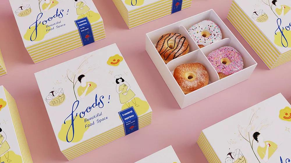 甜甜圈外帶盒包裝設(shè)計(jì),采用藍(lán)黃對(duì)比色的搭配,以大量的白調(diào)和,對(duì)比色的應(yīng)用使得包裝變得亮眼,整體充滿活力和甜蜜的感覺(jué)。
