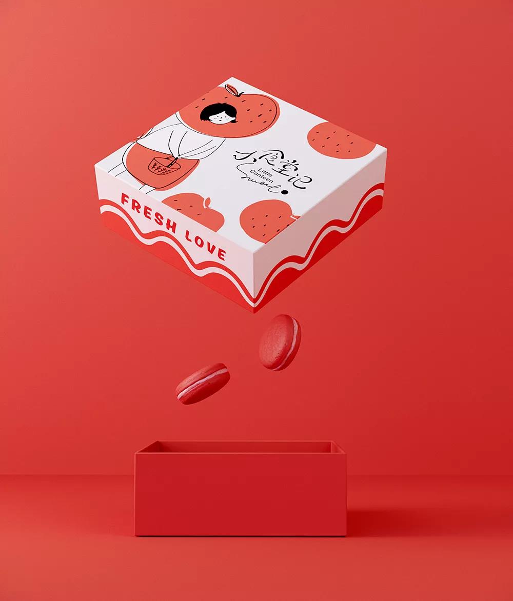 馬克龍外帶盒包裝設(shè)計(jì),是用蘋果、牛奶結(jié)合人物形象,打造出趣味十足的畫面,這種畫風(fēng)十分受年輕女孩的歡迎。