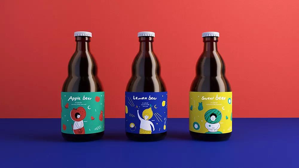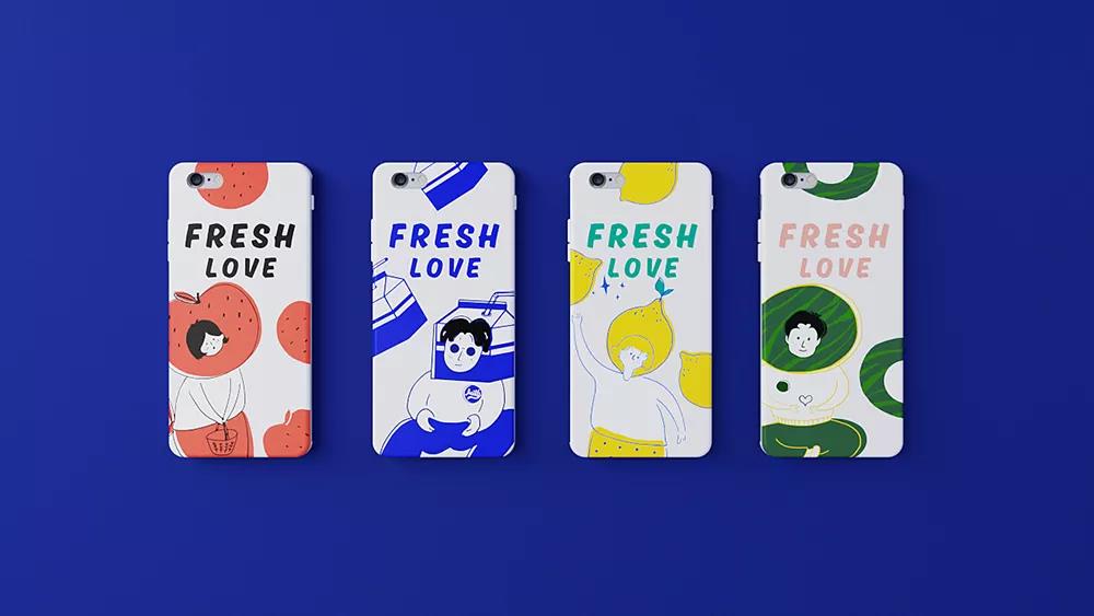 飲品的腰封設(shè)計(jì)按照口味不同,以蘋果、檸檬、西瓜三個(gè)水果形象。水果和人物結(jié)合呈現(xiàn)的手機(jī)殼,紅蘋果、藍(lán)牛奶、黃檸檬、綠西瓜,加上人物表情和動(dòng)作,趣味感十足。