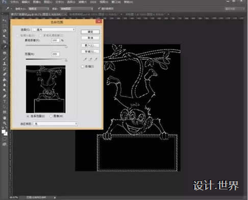 7.接下來,我們要把猴子摳出來。選擇——色彩范圍,因為這張圖片的色彩很少,所以我選擇的是高光,色彩容差和范圍選的是最大的。(其實我覺得這個色彩范圍的功能用來摳圖也是棒棒噠)