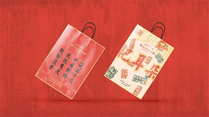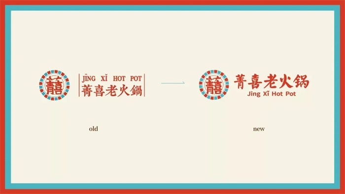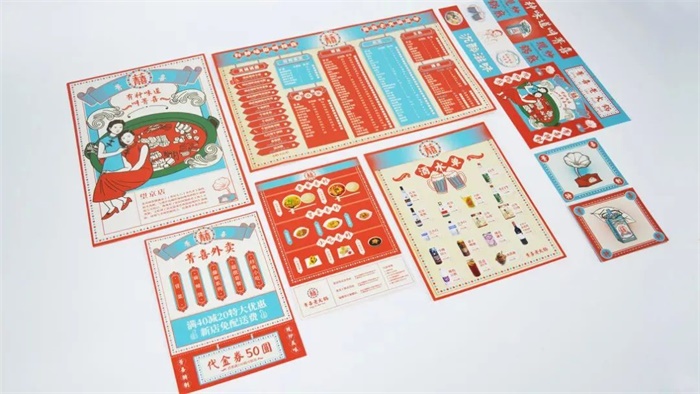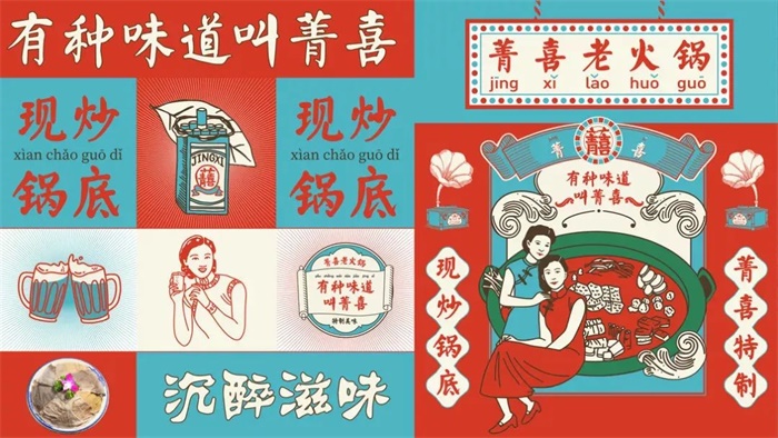 菁喜火鍋新的LOGO設(shè)計(jì)打破了舊式標(biāo)志古板、規(guī)整的框線,將字體放大化并作為主視覺,采用了民國風(fēng)的顏色、插畫以及版式,和低飽和度的紅、灰、藍(lán)色調(diào),突顯出該品牌的特色,運(yùn)用了對稱的版式設(shè)計(jì),結(jié)合新民國風(fēng)的人物插畫形象,使民國風(fēng)更加鮮明。利用對稱連續(xù)的紋樣,加以線條豐富其設(shè)計(jì)形式,延續(xù)了品牌的復(fù)古民國風(fēng)調(diào)性,喇叭留聲機(jī)、紙盒飲料生動還原了新民國時期的生活氣息。放射線的復(fù)古底版設(shè)計(jì),搭配新鮮豐盛的食物,突顯了視覺印象,使畫面飽含跳躍感,加深了消費(fèi)者對產(chǎn)品的印象。