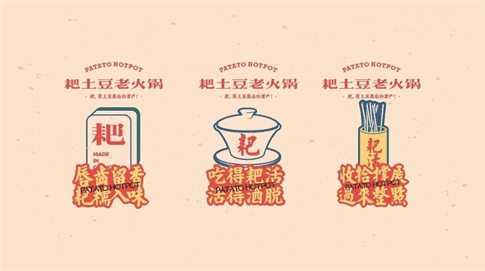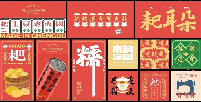 這家叫耙土豆老火鍋的火鍋品牌以土豆作為主角,打出“耙,是土豆最后的尊嚴(yán)!”的口號,告訴人們土豆就該“耙”著吃。這套VI視覺設(shè)計(jì)是土豆、麻將、懷舊玩具等元素的集結(jié),充滿市井的感覺。顏色搭配上,以番茄紅為背景色,搭配土豆色的字體,既有扁平硬朗的字體樣式,也有菱角分明的字體。
