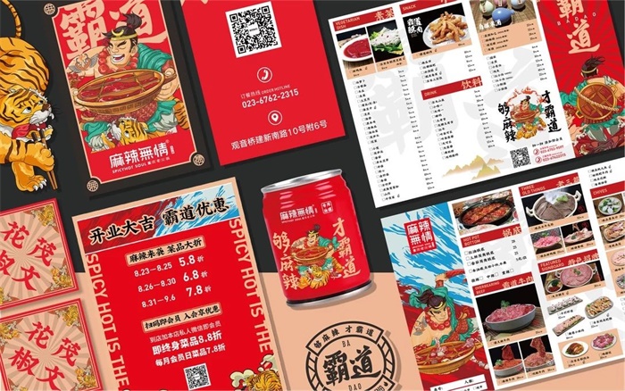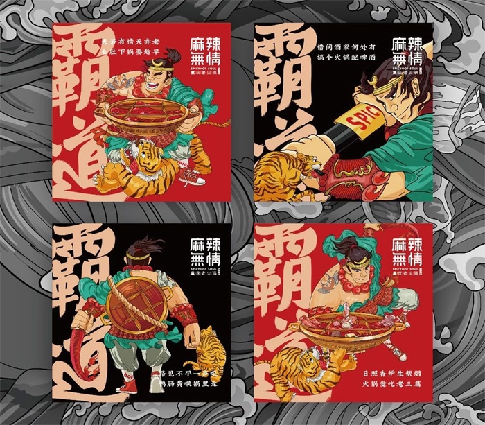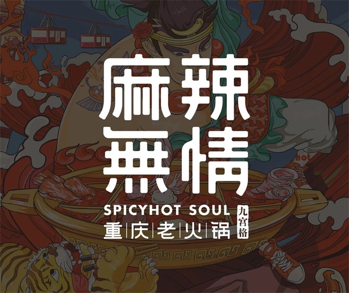 麻辣無情重慶老火鍋這家主打“麻辣火鍋”的餐廳,同樣以年輕群體為主,故用辣椒紅作為品牌的主色調(diào)以刺激消費(fèi)者的食欲。采用繁字體進(jìn)行設(shè)計(jì)的品牌標(biāo)識,slogo“夠麻辣 才霸道”,以更強(qiáng)烈地確定品牌的調(diào)性和認(rèn)知度,用“霸道”來詮釋重慶文化的江湖氣息。該品牌還針對重慶的江湖地域特性,和火鍋本身傳達(dá)的“熱鬧”“爽辣”屬性重新設(shè)計(jì)了“武松”這一江湖俠客形象,同時還設(shè)計(jì)了輔助圖形,包括重慶著名景點(diǎn)的元素等,以更有力的視覺符號提高品牌設(shè)計(jì)的識別性。