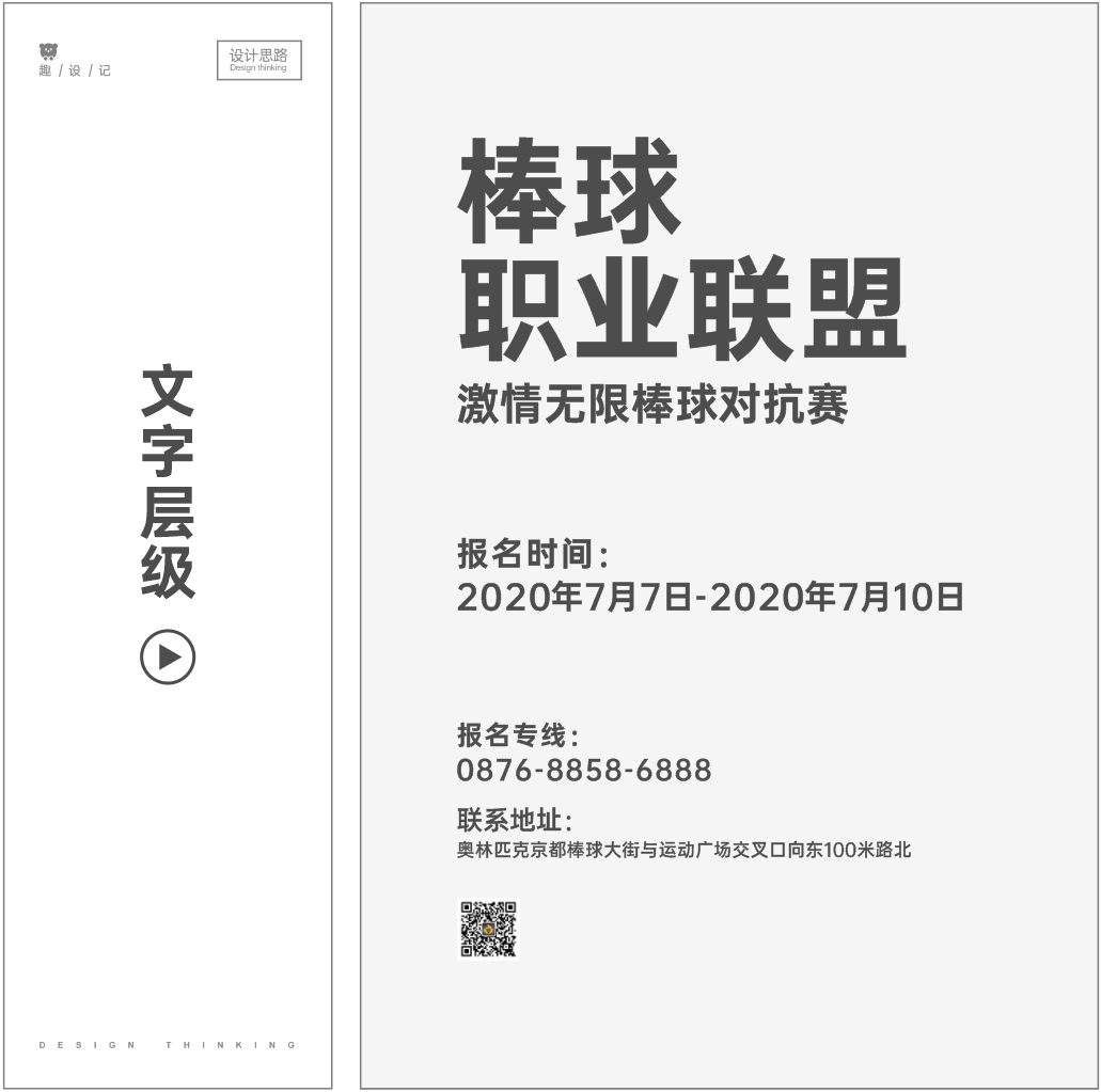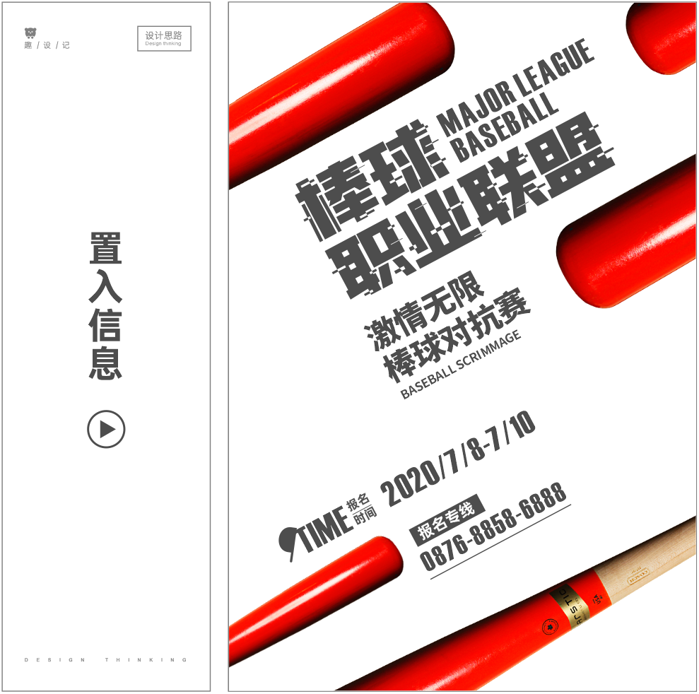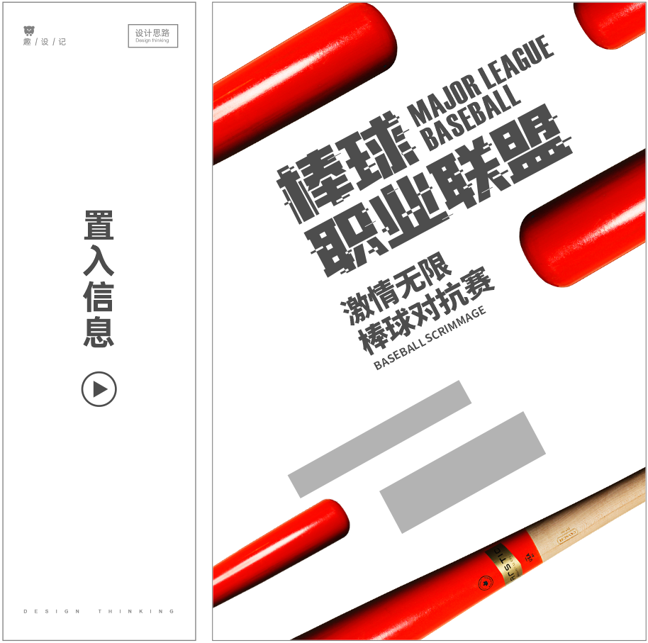 02 > 主體刻畫 。可以看出構(gòu)圖里面是很多傾斜的方塊,那么結(jié)合剛才列出來的元素,我們可以選擇跟線類似的素材,很顯然,棒球棒就是一個不錯的選擇,剛好用來做法天象地。將棒球棍把灰色塊代替,畫面感實際就已經(jīng)出來了。接著處理主標題,剛才說到要粗黑體,所以這里選擇字魂143號-正酷超級黑,搭配長型的英文翻譯,選用這個英文字可以很好的填補棒球右側(cè)的空間,而且并不會過于參差不齊。為了匹配整個畫面的動感趨勢,將主標題加上一些短橫線增加動感,再將副標題也搭配英文做個層次對比,這里需要注意主標題和副標題之間的間距。把主圖和主標題都放到畫面中,再將剩余信息的位置標出來。