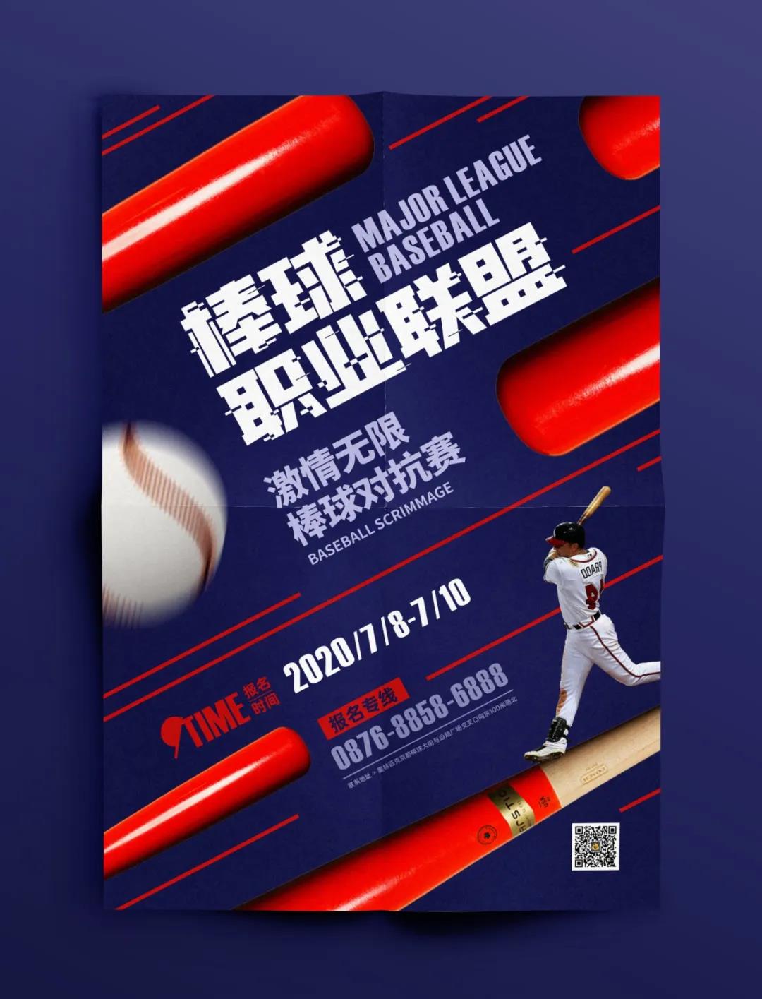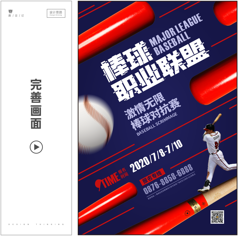 04 > 優(yōu)化版面 。接著我們來搭配顏色,剛才提到,運動類的海報可以選用深色的配色,所以以深藍作為背景,加上漸變,文字的色彩明度做一個區(qū)分,同時呼應(yīng)紅色。最后我們可以看出畫面中還有空的位置,剛好加上一個主人物,形成特異(請忽略人物身上反過來的數(shù)字,我就是懶,不想處理),再加上一個動感的棒球,傾斜的線條來增強畫面氛圍,豐富畫面,海報就完成了。