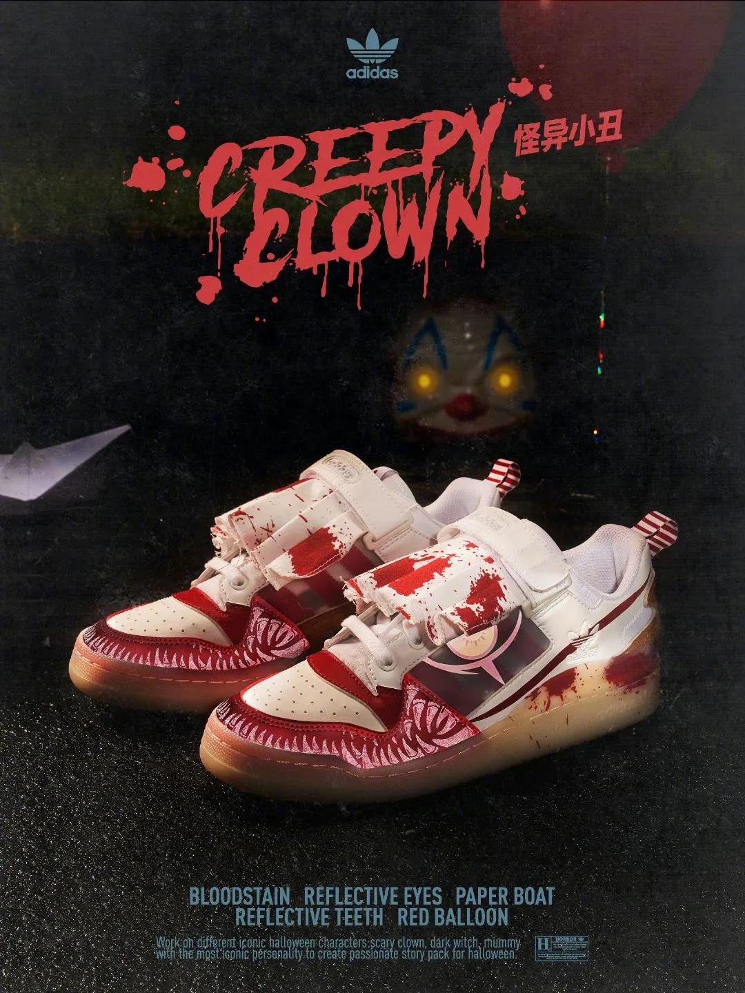 當然一些品牌商家們還是會借勢搶占市場、搶奪眼球。比如adidas出品了Originals Halloween系列,進入阿迪首頁就滿滿的恐怖氛圍。阿迪這次的萬圣「心動」體驗系列可謂是主題感、氛圍感十足,再加上復古恐怖風格的海報設計。讓我們一起來欣賞一下:小丑面龐反光呈現,“鞋”惡獠牙布滿鞋身