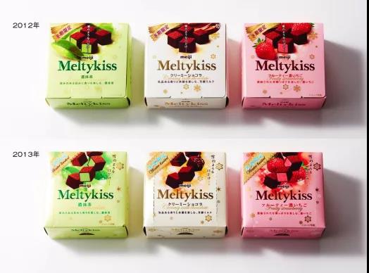 2013年的雪吻巧克力,在設計上一改之前巧克力“落地”擺放的形象。小川裕子說到,過去的包裝,巧克力都是放在桌上的一種感覺,而這版的包裝上巧克力仿佛飄在空中,這樣巧克力就更像雪花,表達了巧克力如雪花般慢慢融化的感覺,希望戀人可以在雪中享受巧克力。