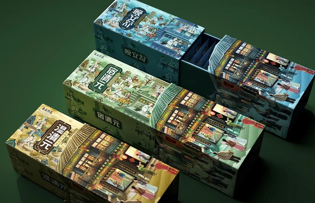 外盒包裝以藥都里仁街為背景,提煉里仁街、中醫(yī)館及華佗等的代表元素,構(gòu)建一個(gè)傳統(tǒng)中醫(yī)館的形象,特定場(chǎng)景的畫面布局體現(xiàn)了華佗的養(yǎng)生茶工藝,進(jìn)一步塑造產(chǎn)品關(guān)聯(lián)性。同時(shí)為了區(qū)分養(yǎng)生茶品類,外觀采用三種清雅古韻的性質(zhì)用色,結(jié)合立體感十足的插畫,將元素融合成獨(dú)特的有文化承載的視覺符號(hào),打造一款差異化的養(yǎng)生茶產(chǎn)品形象。