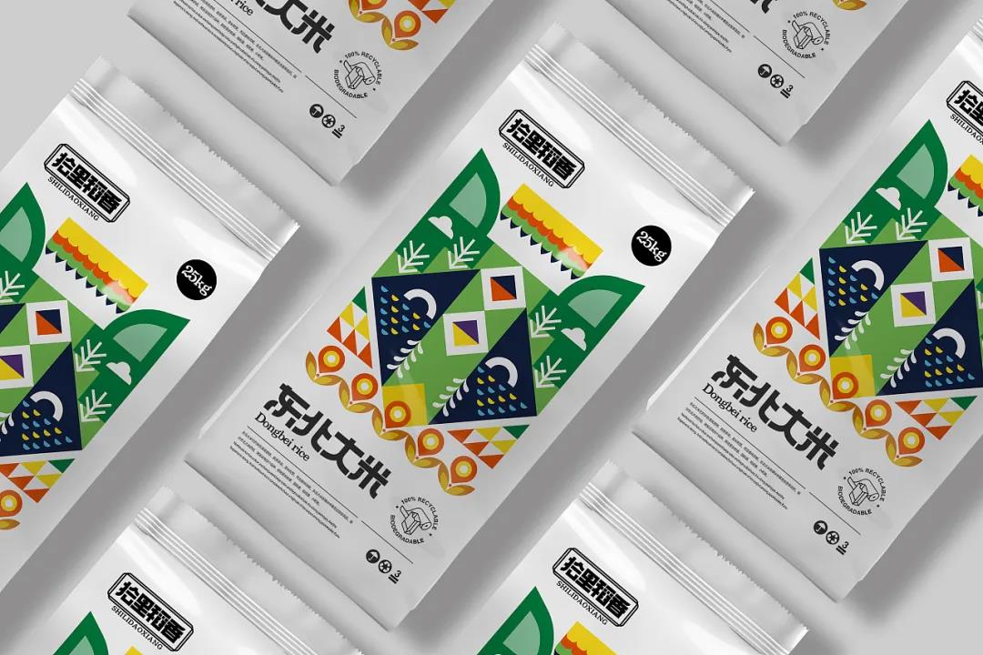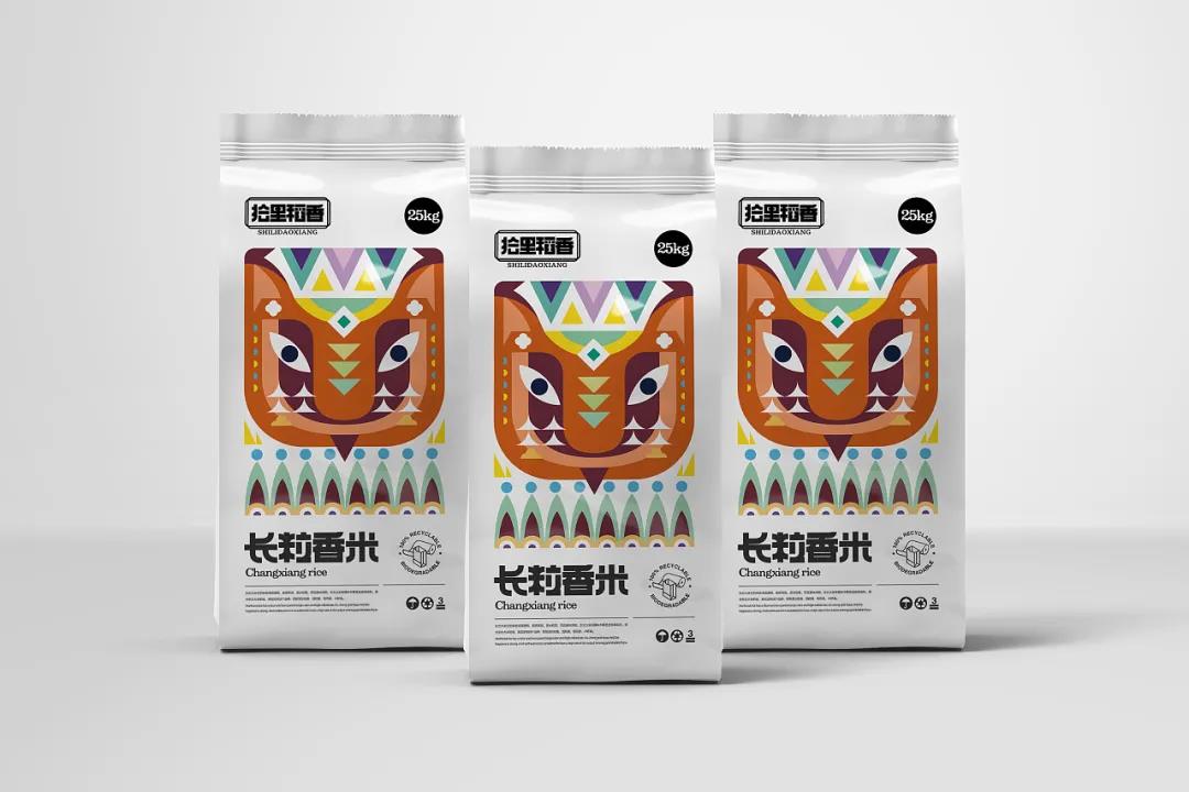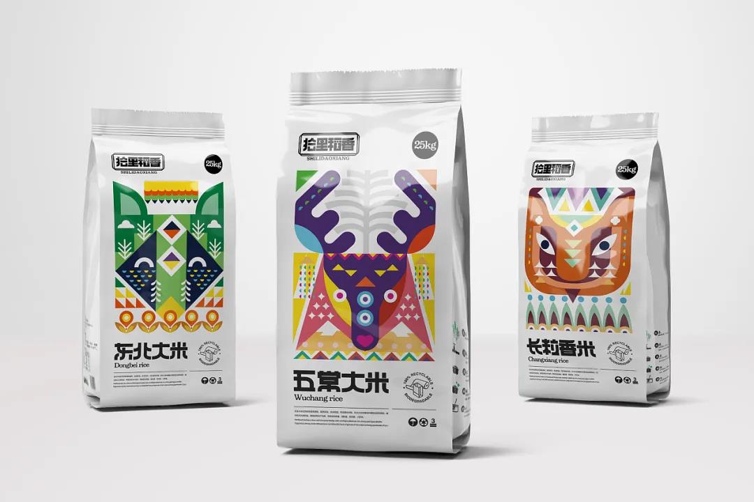 首先品牌根據(jù)產(chǎn)品的不同特性,分為三款風(fēng)格包裝,整體夸誕而現(xiàn)代的設(shè)計(jì),賦予包裝新的生命力。極簡(jiǎn)白的外袋包裝下,封面采用了幾何圖形拼貼的形式,并以此抽象化為動(dòng)物頭像,突出了大米生長(zhǎng)地的代表性元素。