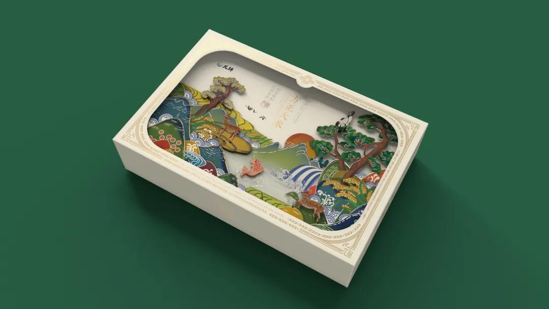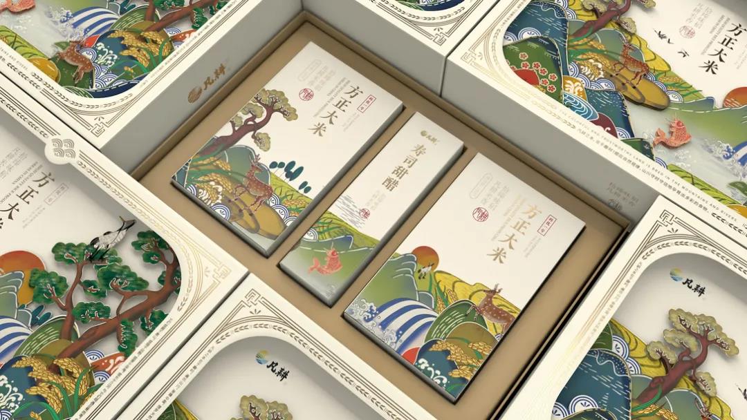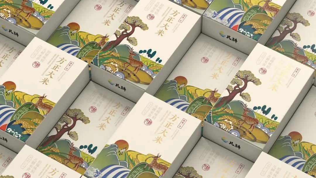 產(chǎn)自東北優(yōu)質(zhì)種植區(qū)域的凡耕大米,以“順應(yīng)自然規(guī)律”為理念,憑借四季分明、雨水充足的自然條件,培育出天然、健康、優(yōu)良的品質(zhì)大米。首先外盒采用鏤空式設(shè)計(jì),提取東方設(shè)計(jì)美學(xué)中常見的花紋元素,金色描邊更顯禮盒包裝的貴氣、優(yōu)雅,讓消費(fèi)者有種仿佛正在欣賞優(yōu)秀畫作的感覺,增強(qiáng)整體包裝的立體感。插畫風(fēng)的設(shè)計(jì)延續(xù)中國(guó)傳統(tǒng)美學(xué)底蘊(yùn),畫面融入了江河、田野、高山、野鹿等元素,低飽和度色調(diào)的運(yùn)用營(yíng)造溫馨的氛圍,日落西方的場(chǎng)景描繪結(jié)合米白色調(diào),更能讓人沉浸其中。