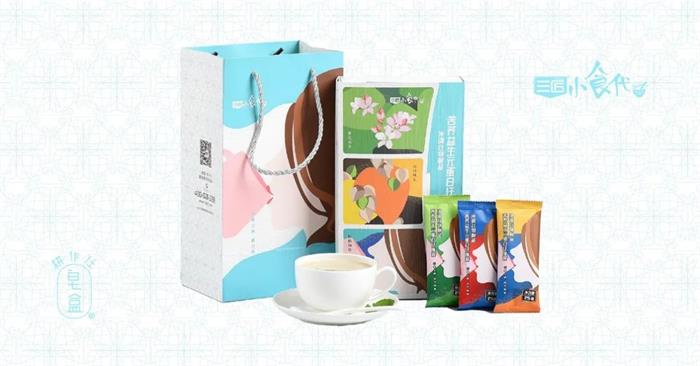 這款沖調谷物制品以豐富的插畫為主視覺,靈感來源于大涼山上的古老作物--苦蕎食材,而清新風格的畫面內容則是以此傳達產品制作材料的天然、健康特性。外盒采取疊層設計的形式展現,天藍色搭配規整的裝飾花紋的外觀設計基礎上加入了帶有弧度的立體標簽貼,剪影式的插畫描繪了女生、花卉等主要元素,抽象表達了產品的屬性。