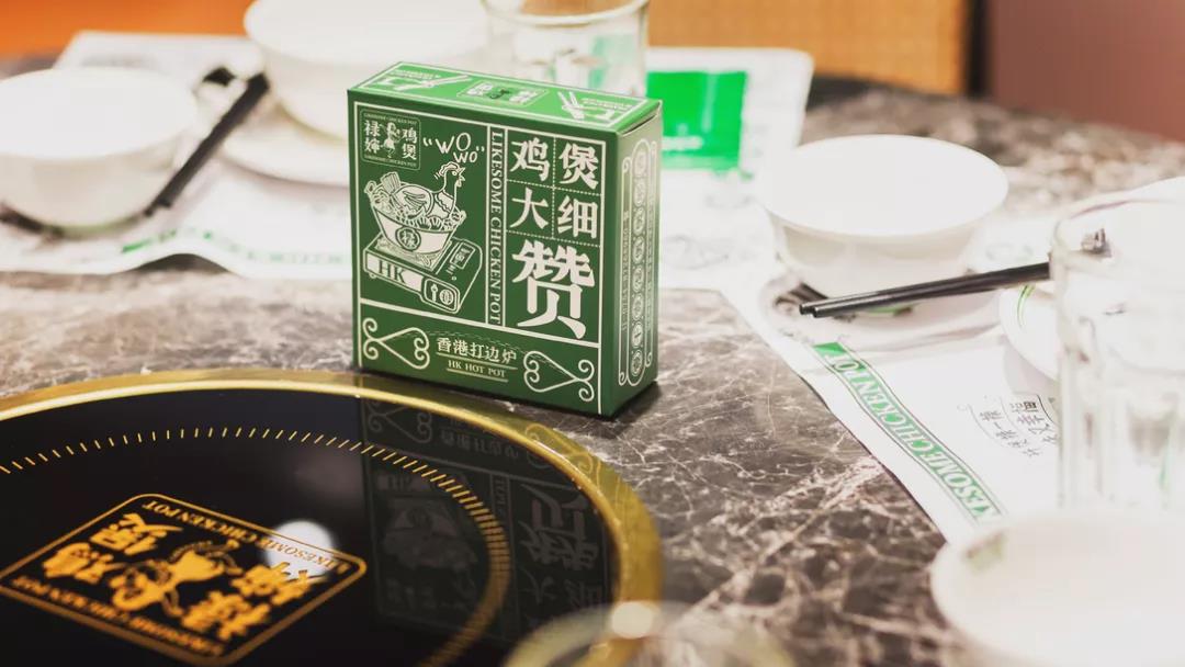 品牌的LOGO圖案是一只帶著盔帽、雙翅拿著手槍的金色立體雞形象,探出方形的紅色底色,探吉雞煲四字兩兩上下分布,字體線條粗大寬扁,頗有種財大氣粗的感覺,小銅錢在左下角與英文組合,使LOGO的呈現形態更加統一完整。因為與吉利、財神等掛鉤,所以品牌在用色上選取了財神紅,搭配銅錢質感的金屬灰杏色,黑色用于強調氛圍感。