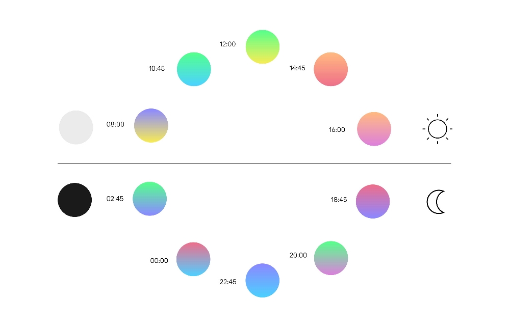 該設(shè)計機(jī)構(gòu)希望通過一套帶有情感的圖形,來詮釋不斷變化的能量狀態(tài)。這些形狀通過強(qiáng)大的調(diào)色板得到呈現(xiàn),這些調(diào)色板的靈感來自于全天不斷變化的光線顏色。