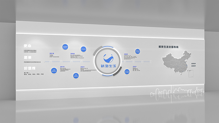 在設計文化墻之前,我們需要首先定位企業文化,并構思如何整體布局。同時,將主體與子區域顯示的內容相結合,完成企業經營理念和服務理念的核心內容,同時色彩與照明與文化墻巧妙融合。